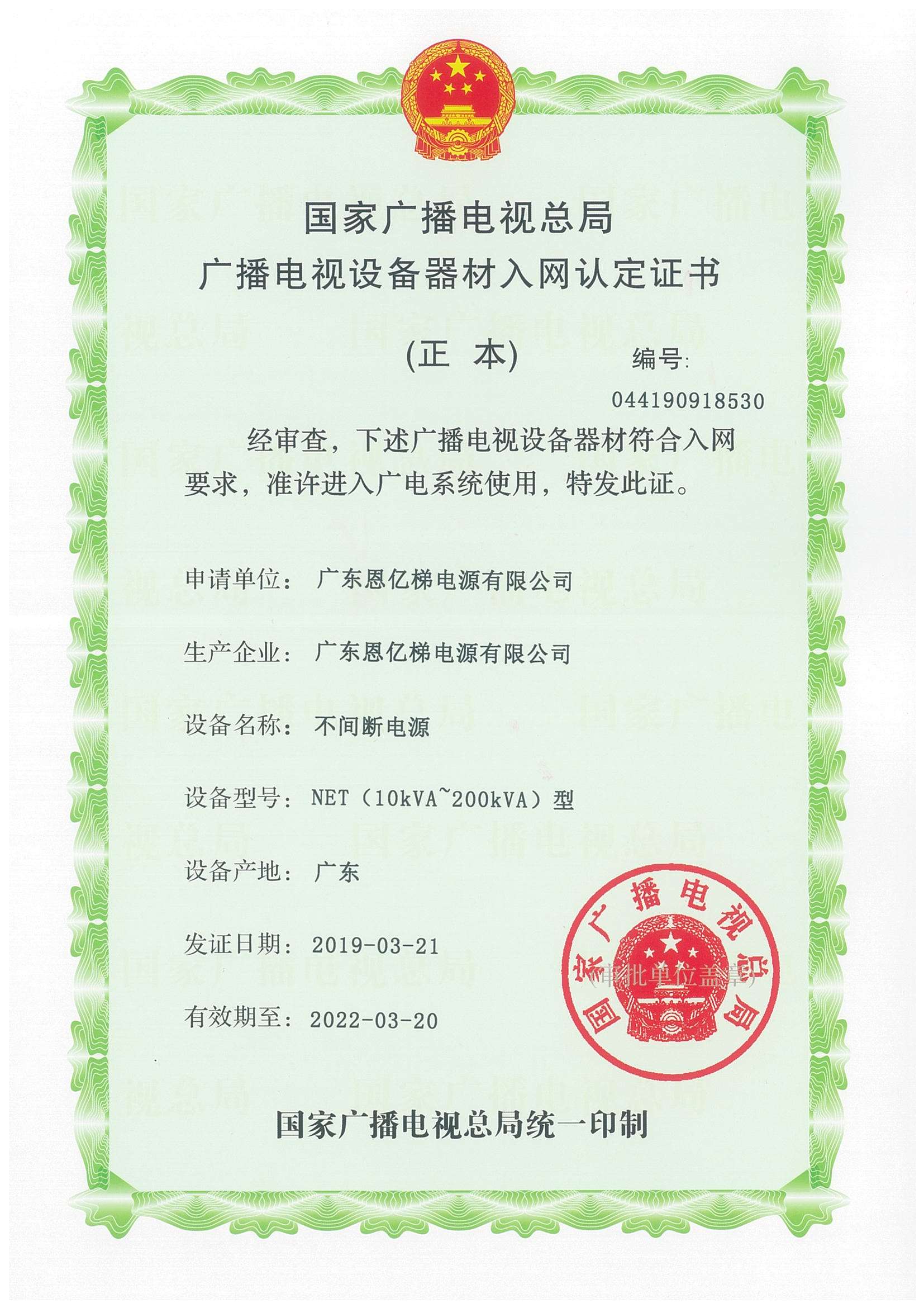 國家廣播電影電視總局入網認定證書(不間斷電源)